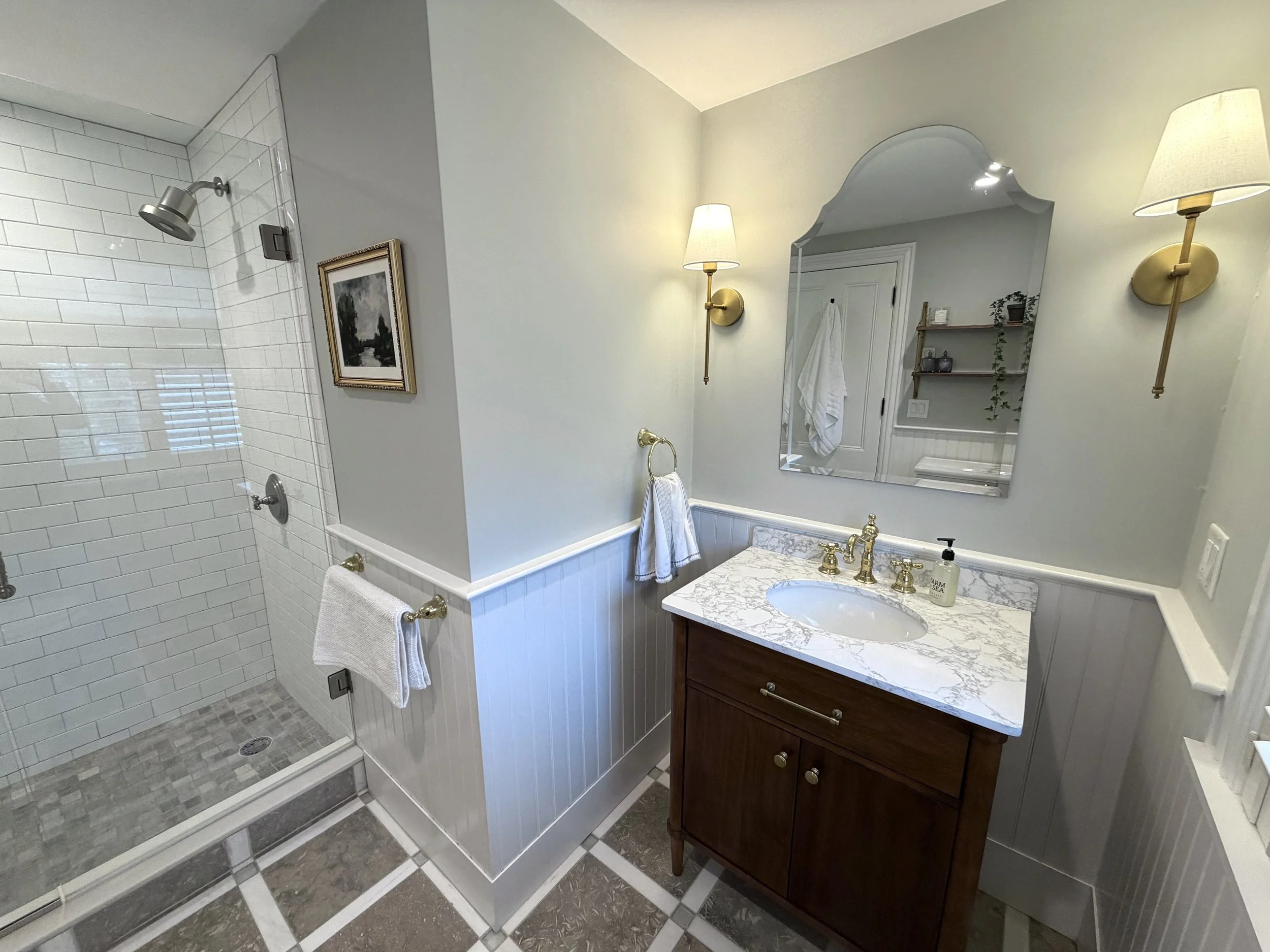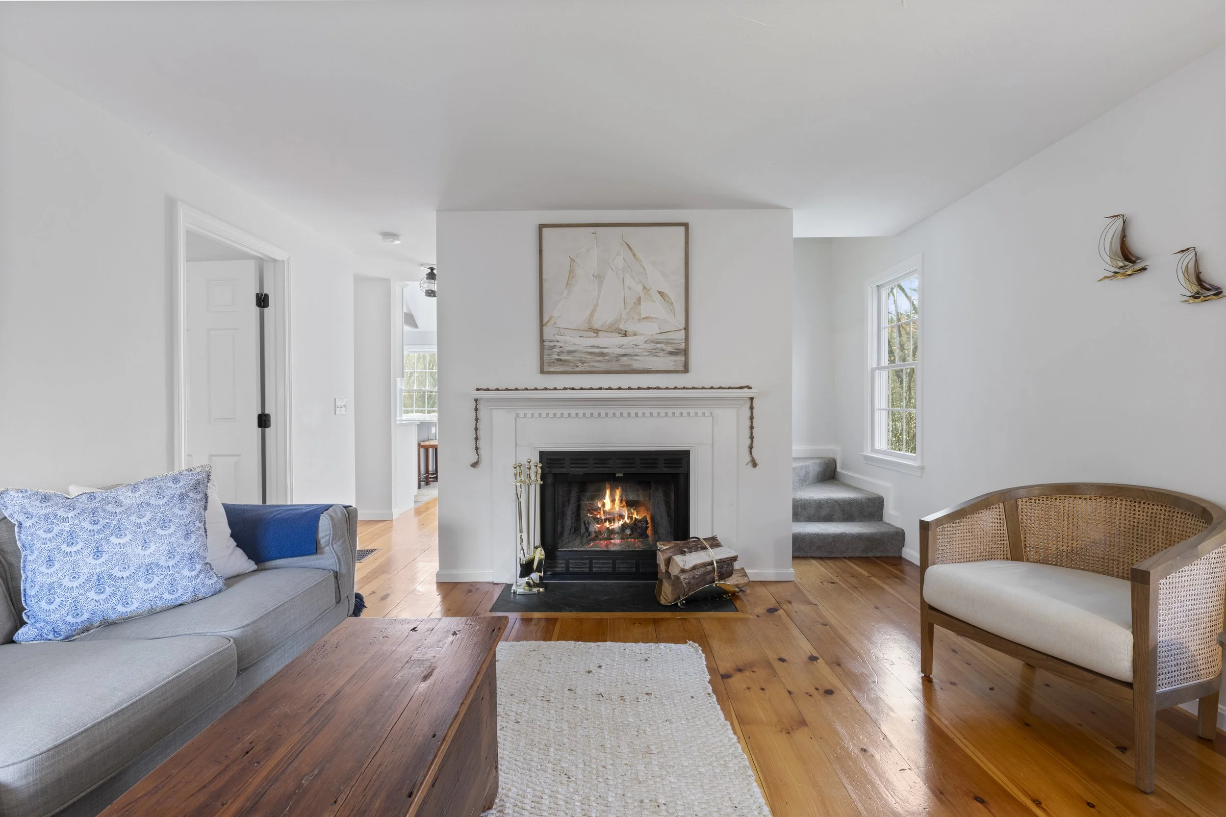 The interior honors the craftsmanship of its era, featuring wide-plank floors, brass fixtures, and timeless William Morris-inspired wallpapers. These historic touches are thoughtfully balanced with coastal influences—light-filled rooms, organic textures, a soft neutral palette, and refined modern finishes. The result is a harmonious blend of old and new: a home that feels rooted in history, yet effortlessly livable, fresh, and serene.