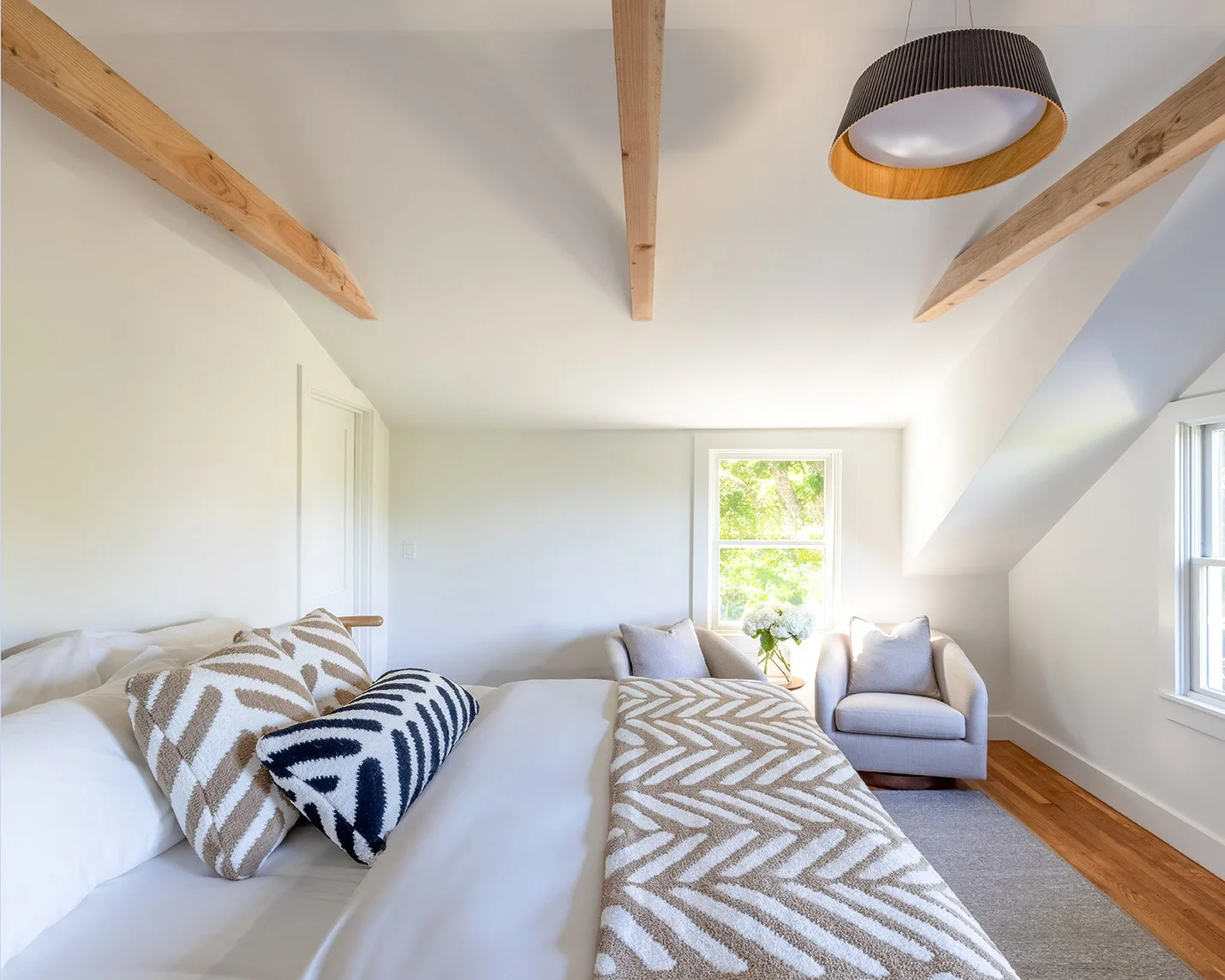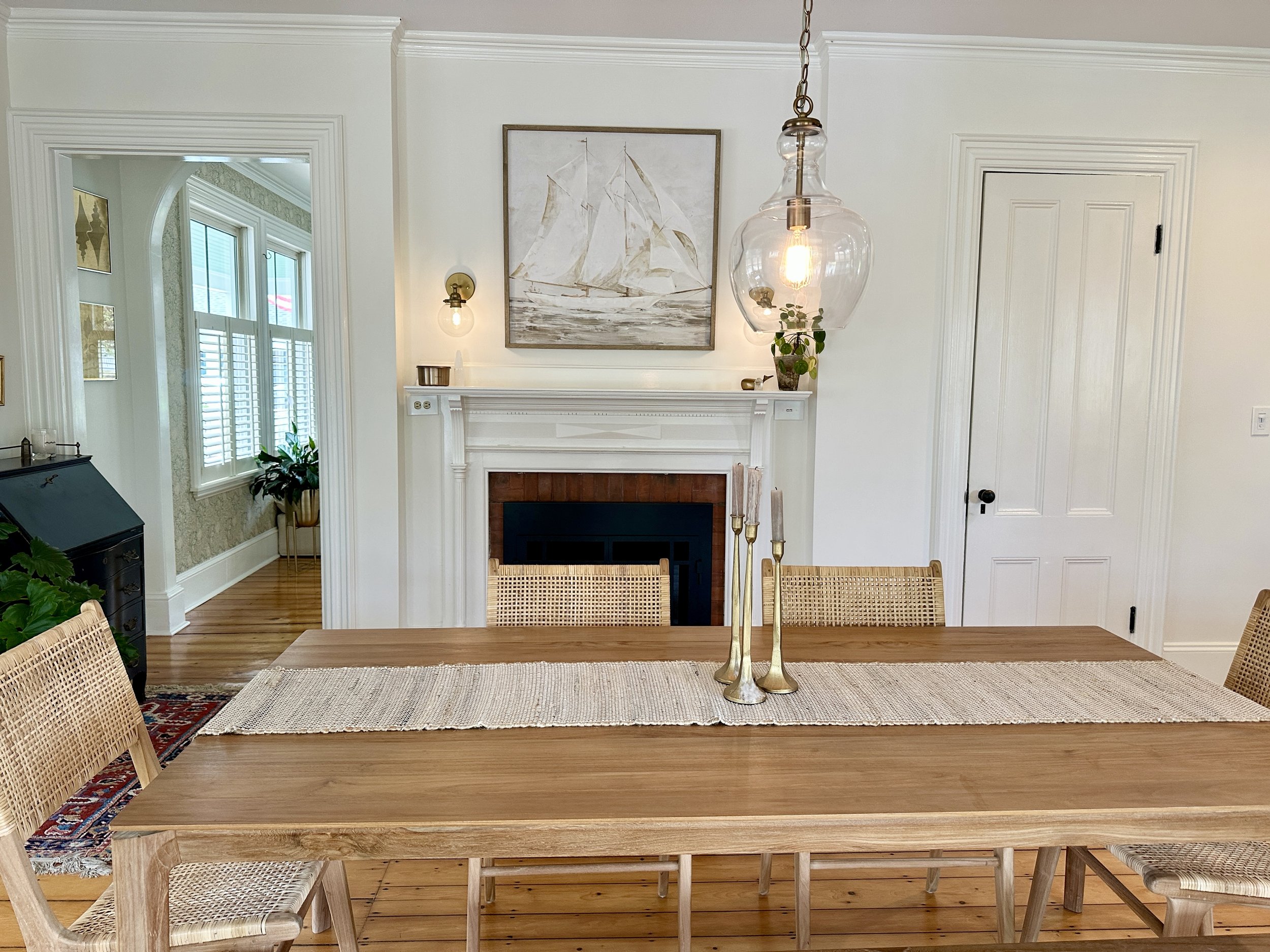 Preserving original features was key. The rustic wood-beamed ceiling in the formal dining room and the character-rich brick fireplace were lovingly restored, anchoring the home in its New England heritage. Inspired by Scandinavian design principles, the space was reimagined with clean lines, a soft, natural palette, and an emphasis on light and texture.